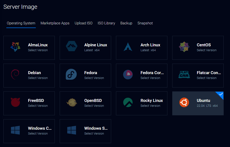 Next, select the Operating System, we’ll be using Ubuntu 22.04 LTS x64.