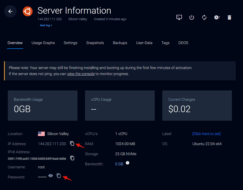 Once your server is ready, visit the instance details page. We’ll grab the server IP Address and root password from this page. For an actual deployment, using the root user is not recommended. We’ll only use root because it’s the quickest way to demonstrate this setup.