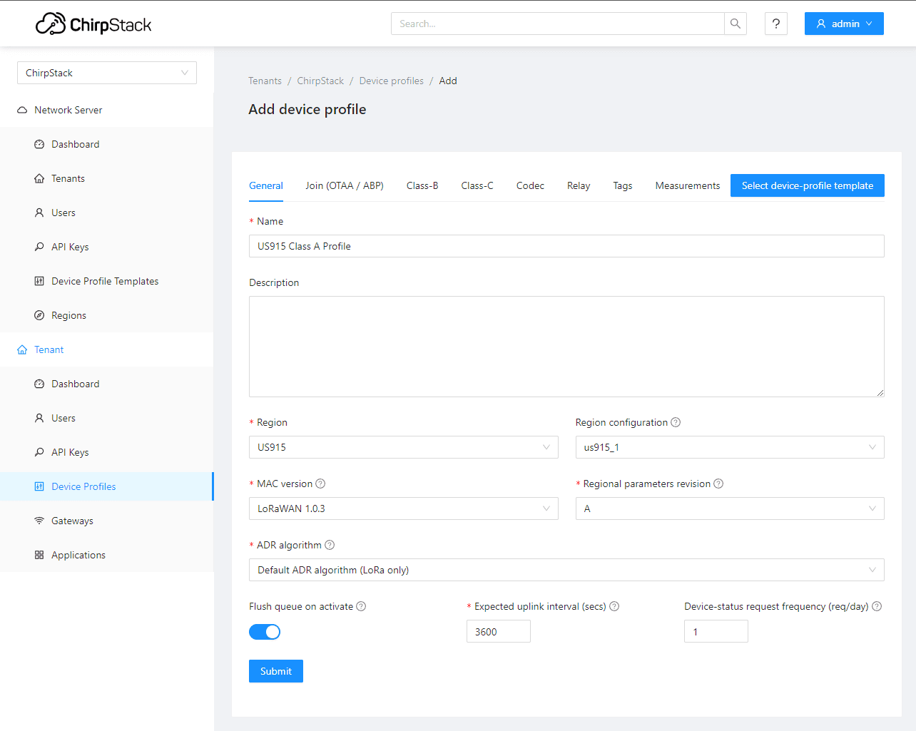 First, we need to create a device profile. This specifies things like the LoRaWAN device region, version, and class.