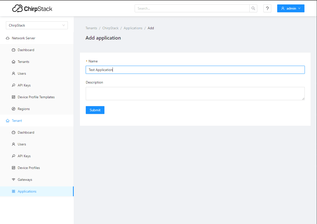 Next, we need to create an application. Devices are grouped by applications in Chirpstack.